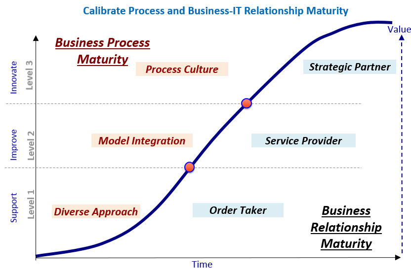 How do you then improve the level of your business relationship with the business? There are numerous paths towards that elusive business-IT strategic partnership. In this post, I will talk about Business Process Maturity as a path— so I would say – Let’s Talk Process First! This has worked for me in the past. One of the most effective ways to change the orientation and focus of business IT interactions is to start with business process. Calibrate your organization’s business process maturity and you will take along with it to a great degree IT-business relationship maturity. What you need are experienced business process managers with business relationship management competencies. Below I will walk you through these 3 stages of Business Process and Business Relationship maturity and describe what it means.