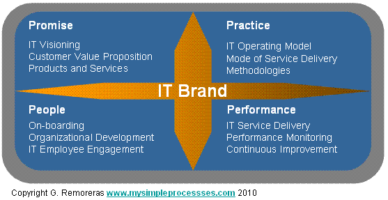 One’s perception of the IT service is often reduced to a phone conversation with a helpdesk service agent. IT branding depends on each and every individual working in the IT organization—the “People”—from the top, the CIO to middle IT managers then to the frontline helpdesk service agents. It is important that all IT personnel are in sync because the service brand is all about them. It is strengthened by the established “Promise” and “Practices” that enables IT organization to deliver with high “Performance”.
