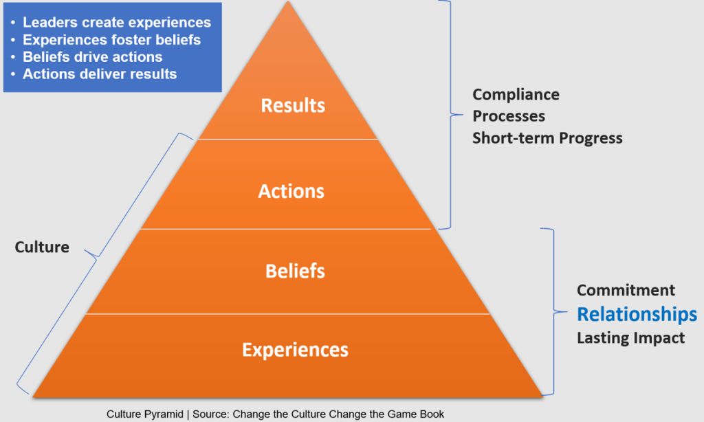 This culture pyramid derived from the book, Change the Culture, Change the Game, is one of the best frameworks to define culture. “Leaders create experiences. Experiences foster beliefs. Beliefs drive actions and actions delivery results.” The combination of experiences, believes and actions is the culture of an organization.