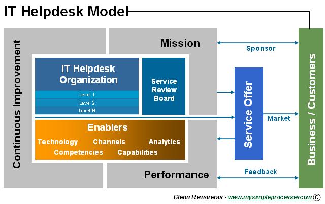- Enablers – Enablers are tangible and intangible components needed to operate the IT helpdesk. This includes technology, tools, communication channels and analytics. Other important enablers are the required competencies of the individual staff working at the helpdesk and the group’s combined capabilities.